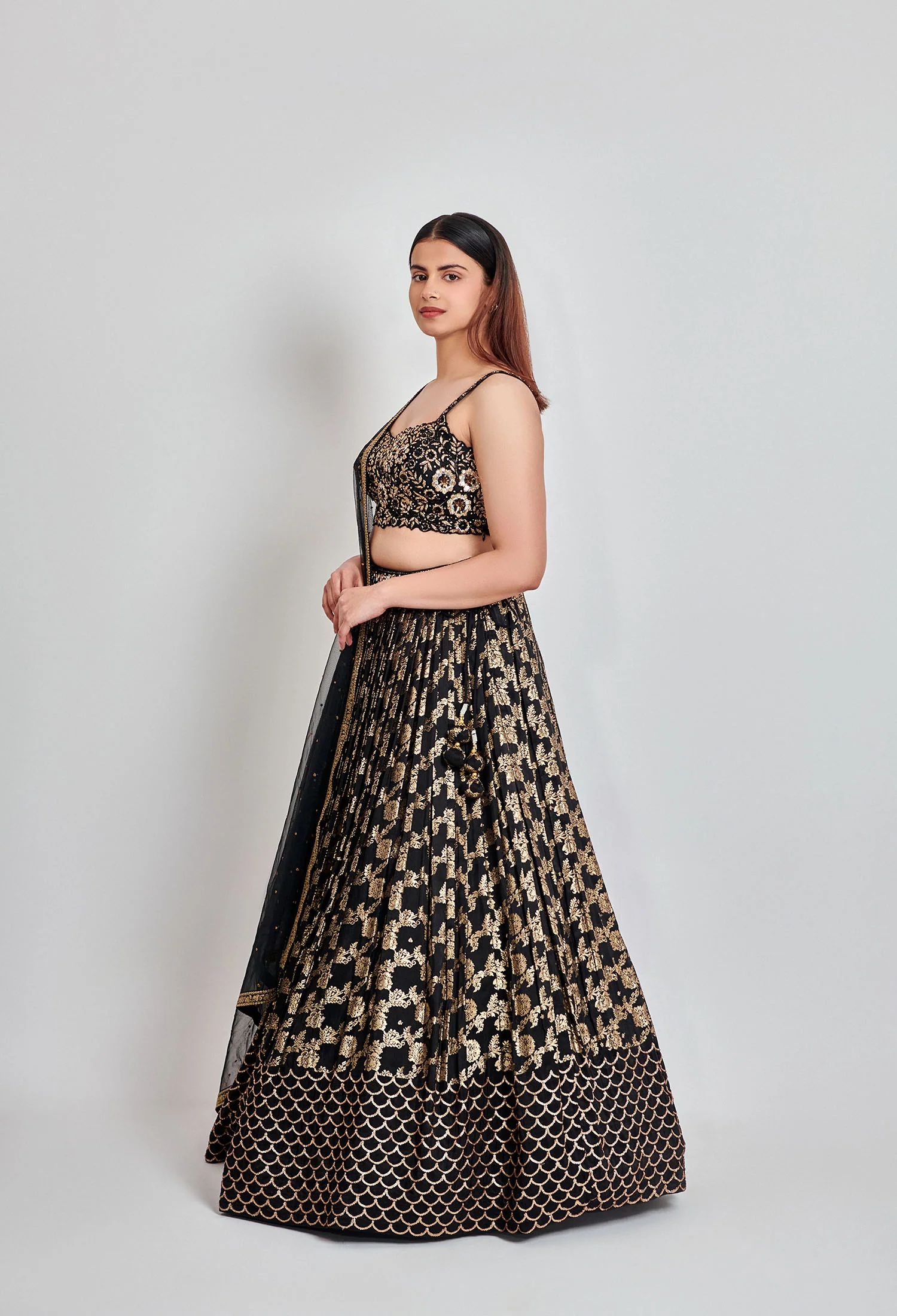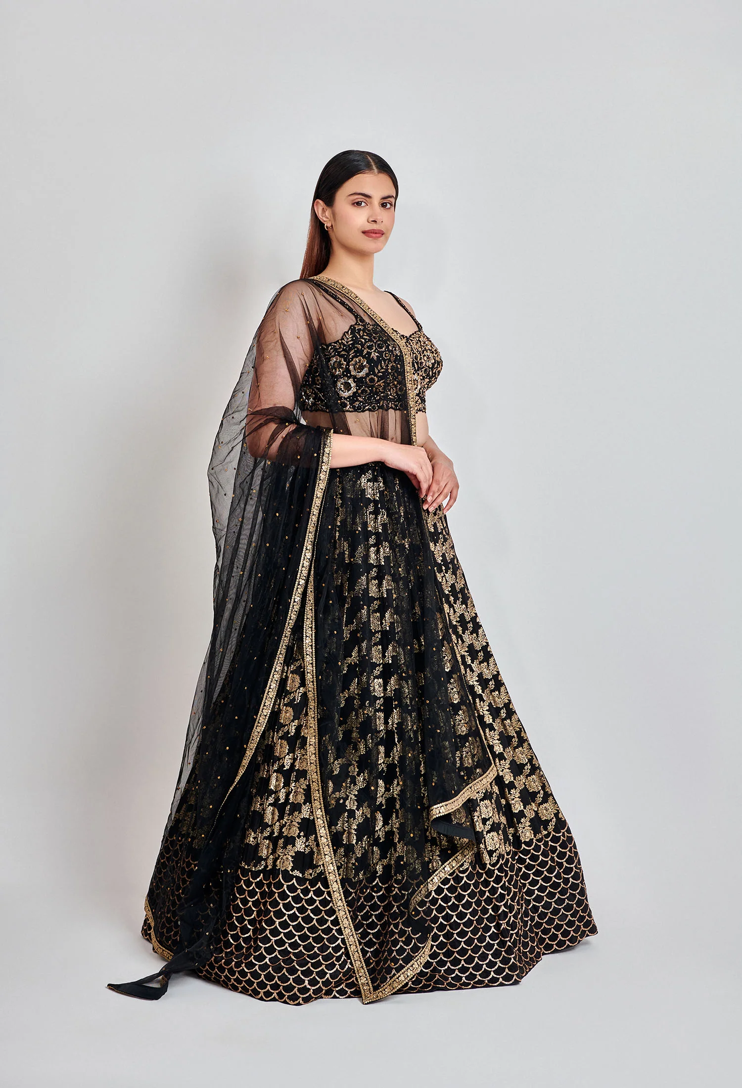 Exuding regal allure, this black and gold lehenga in jacquard features exquisite mirror and badla embroidery with delicate hand embellishments. Paired with a finely detailed net blouse and dupatta, it’s a perfect blend of luxury and tradition.