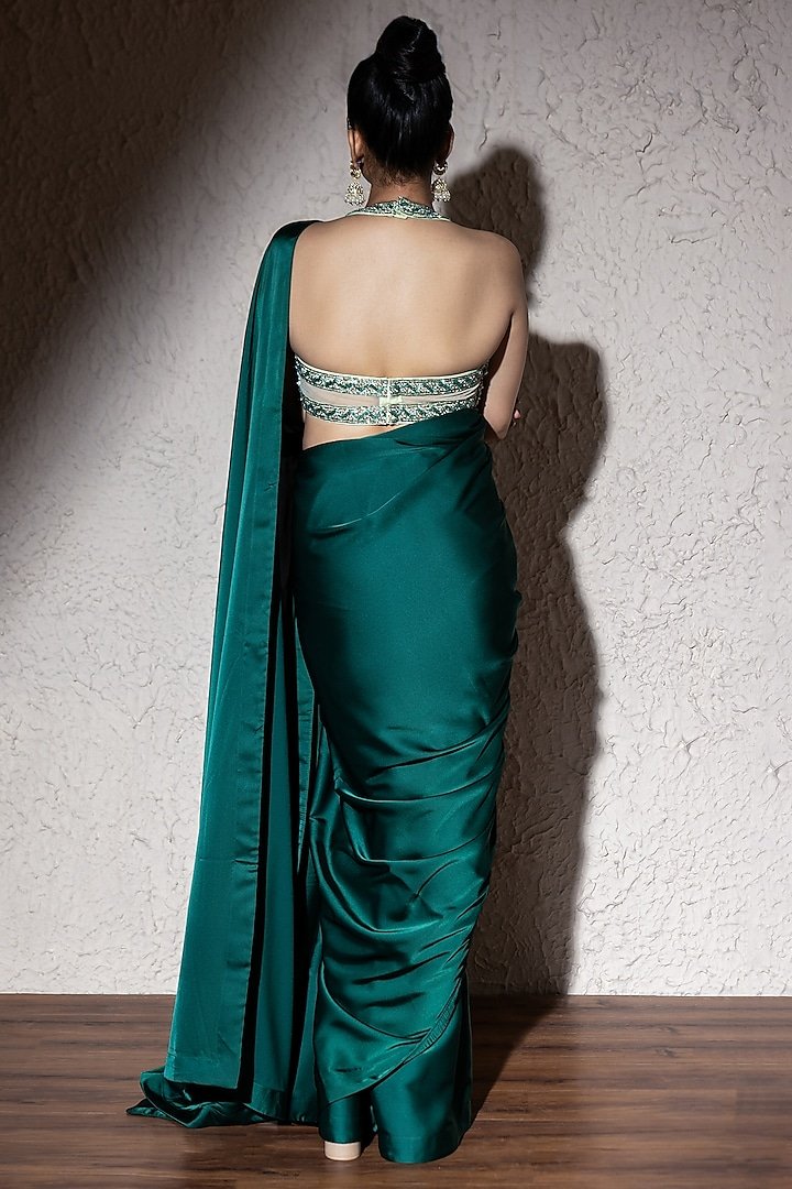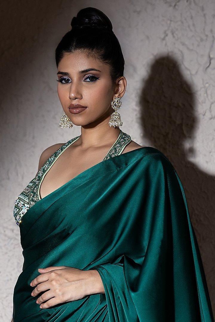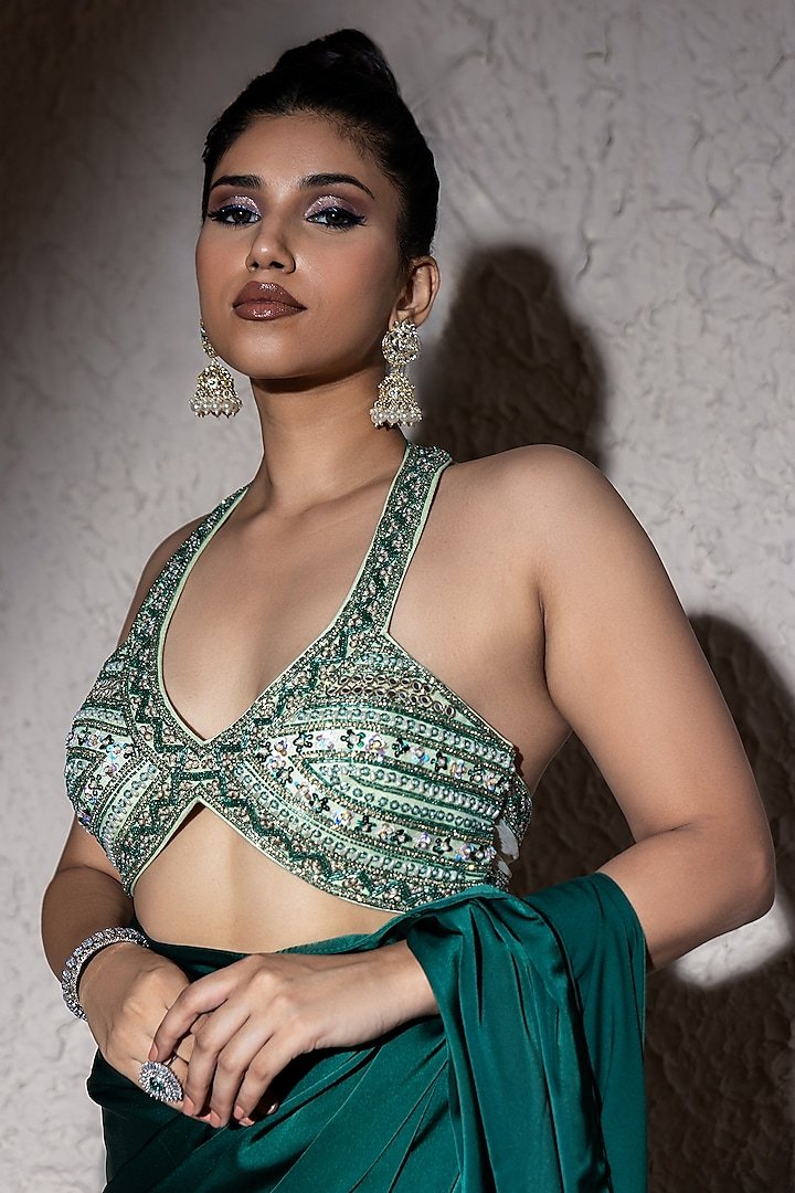 This stunning green Armani satin saree is paired with a halter-neck blouse embellished with pearls, mirrors, zarkan, and sequins. Perfect for festive occasions, accessorize with dangler earrings and heels to complete an elegant, eye-catching look.