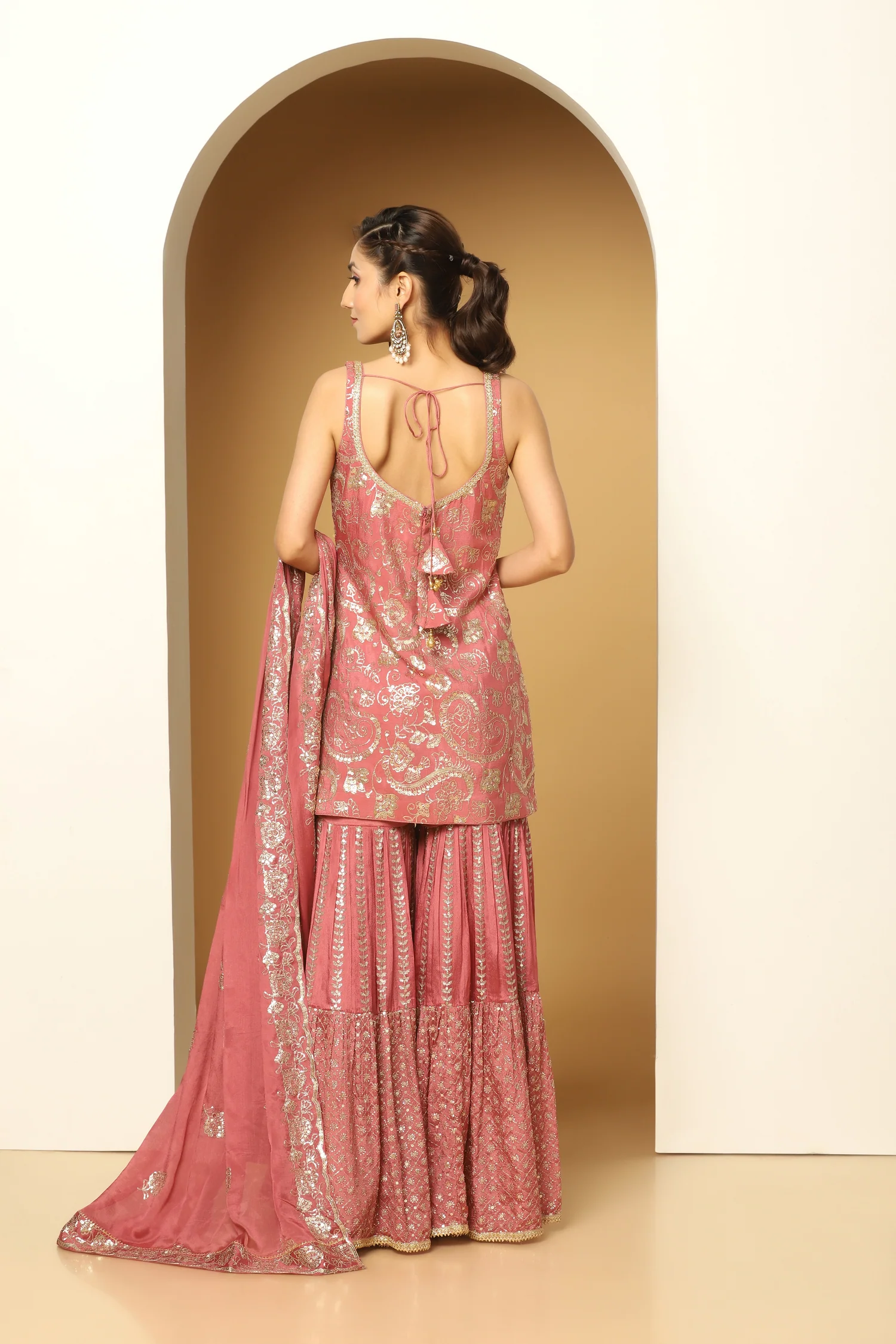This elegant sharara suit features a sequin paisley design on the kurta, with contrasting sequin motifs on the sharara and a sequin-bordered dupatta. Crafted in soft Chinon chiffon, it offers a glamorous, festive look perfect for special occasions.