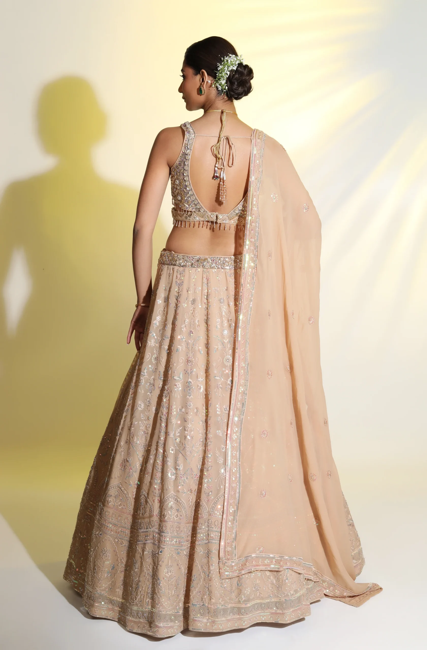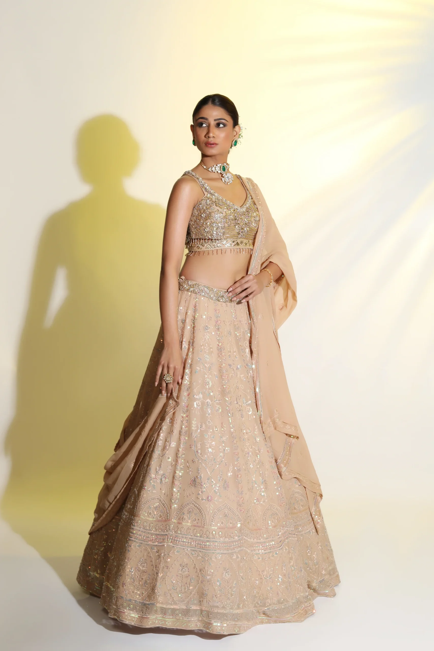 This fawn georgette lehenga features exquisite handcrafted embellishments and a stylish side dupatta, perfect for elegant bridal celebrations.