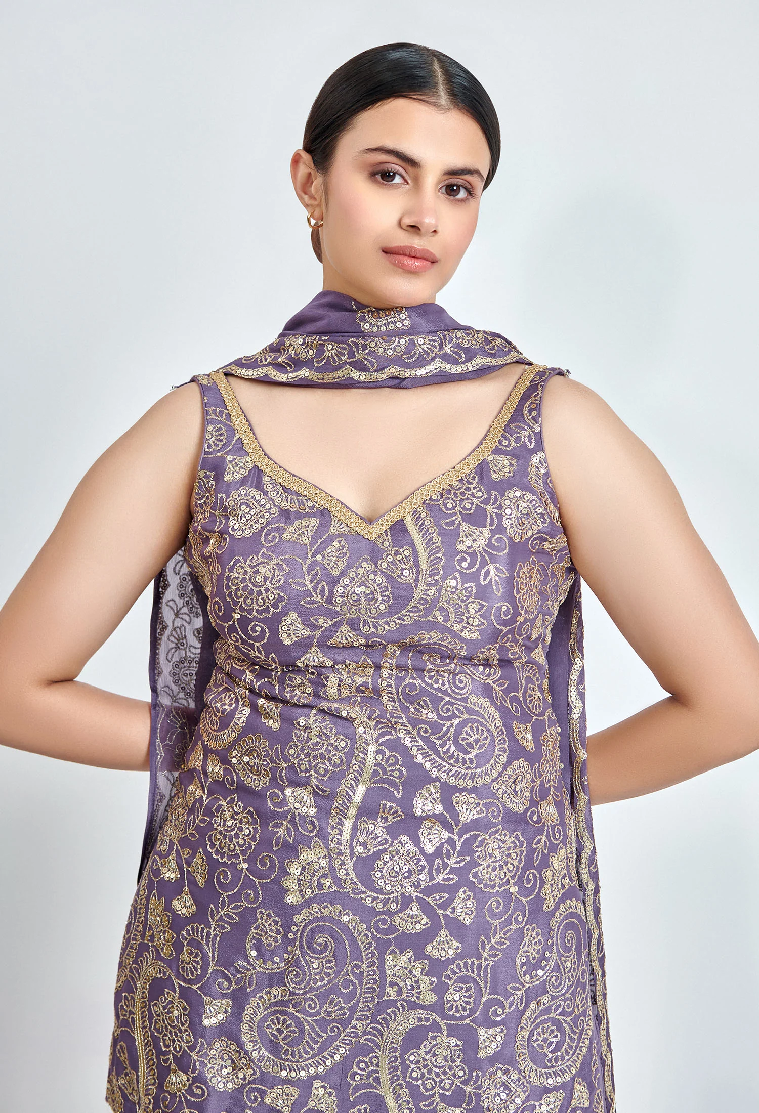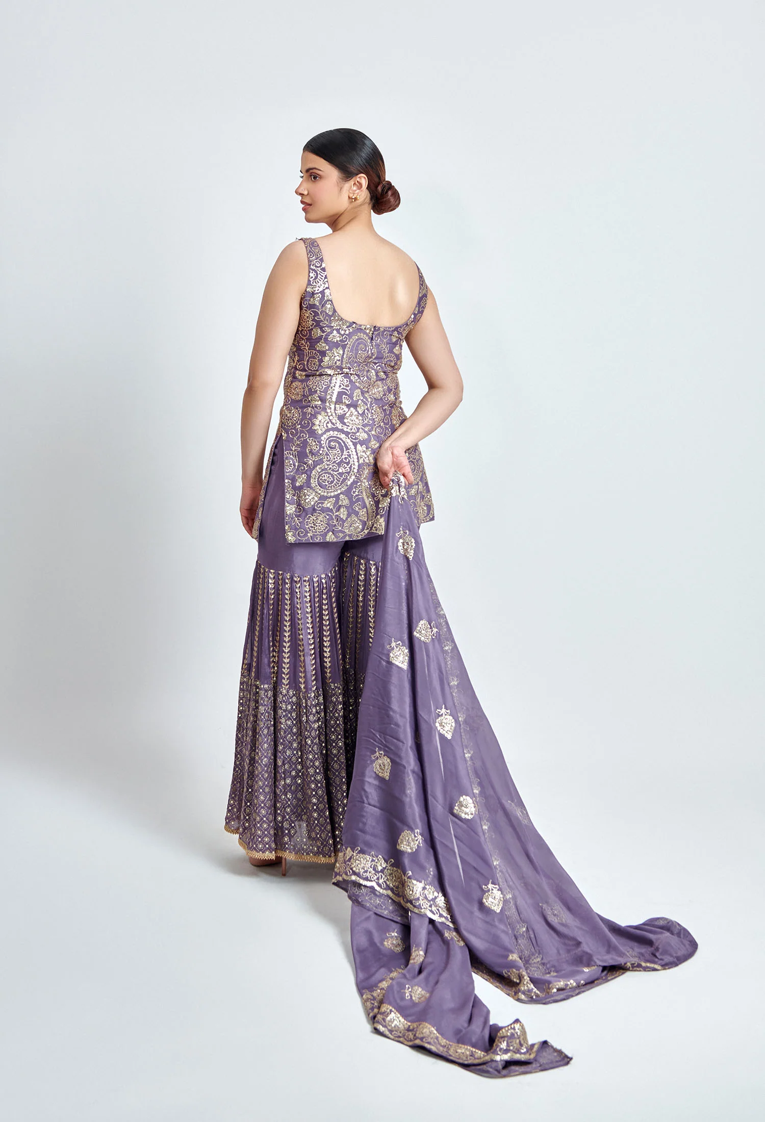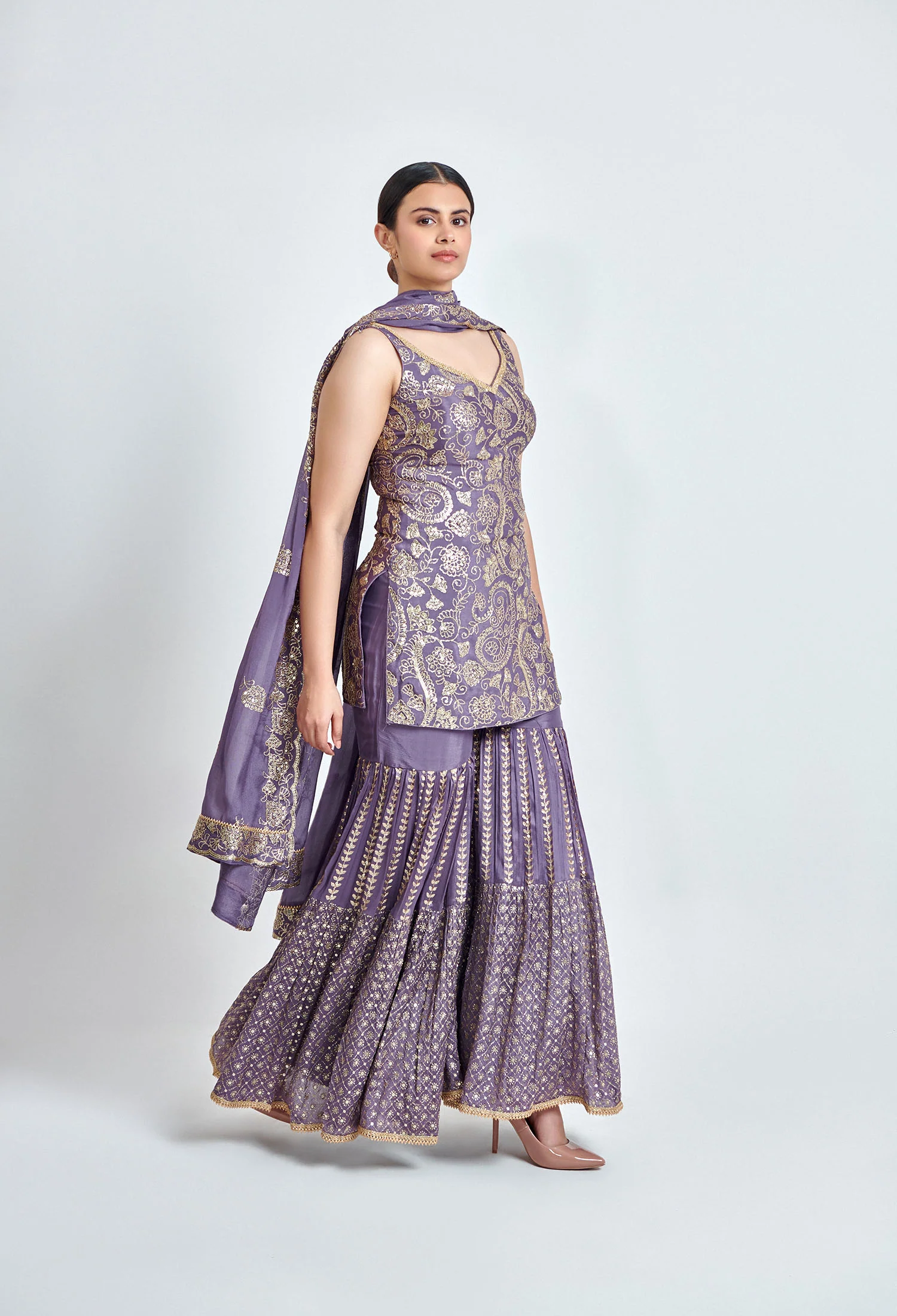 This mauve and gold sharara set is made from soft Chinon fabric with beautiful sequin embroidery. Featuring three types of embroidery work, it includes a matching kurta, sharara, and dupatta perfect for festive and wedding occasions.
