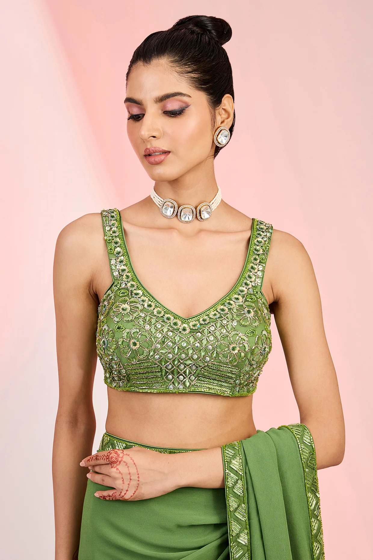 Elevate your look with this mehendi green georgette saree and net blouse, hand-embellished with cutdana, sequins, and beads. Perfect for weddings and special occasions, it combines traditional charm with modern elegance for a truly radiant ensemble.