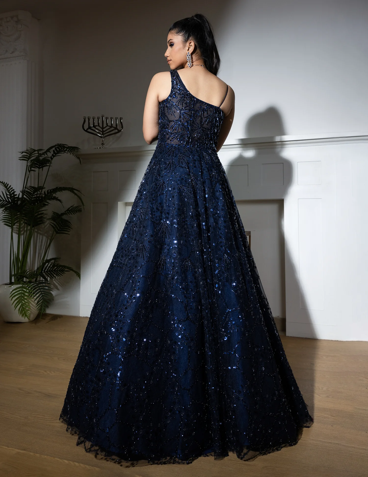 Dazzle in elegance with this Midnight Blue Net Gown, featuring a chic one-shoulder design and a gracefully flared silhouette. Adorned with tone-to-tone sequin and bead embroidery, this gown is perfect for glamorous evenings and special celebrations.